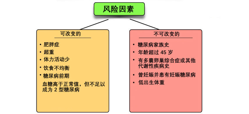 不可改變的危險(xiǎn)因素:糖尿病家族史、年齡在45歲以上、出生體重低、既往妊娠期糖尿病和多囊卵巢綜合征(PCOS)或其他代謝疾病史等。