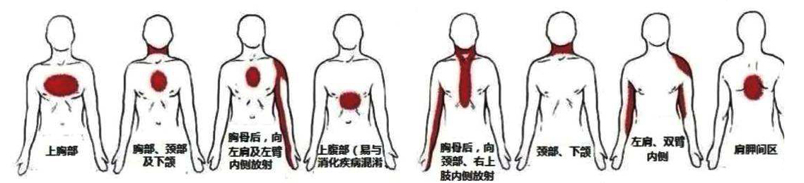 心絞痛是最常出現(xiàn)的癥狀,最為嚴重的心梗可直接表現(xiàn)為心跳驟停也就是所謂的“猝死”。疼痛部位主要在前胸部,可放射至左肩、左臂內(nèi)側(cè)、下頜部、頸部、咽部、上腹部及背部上方等。