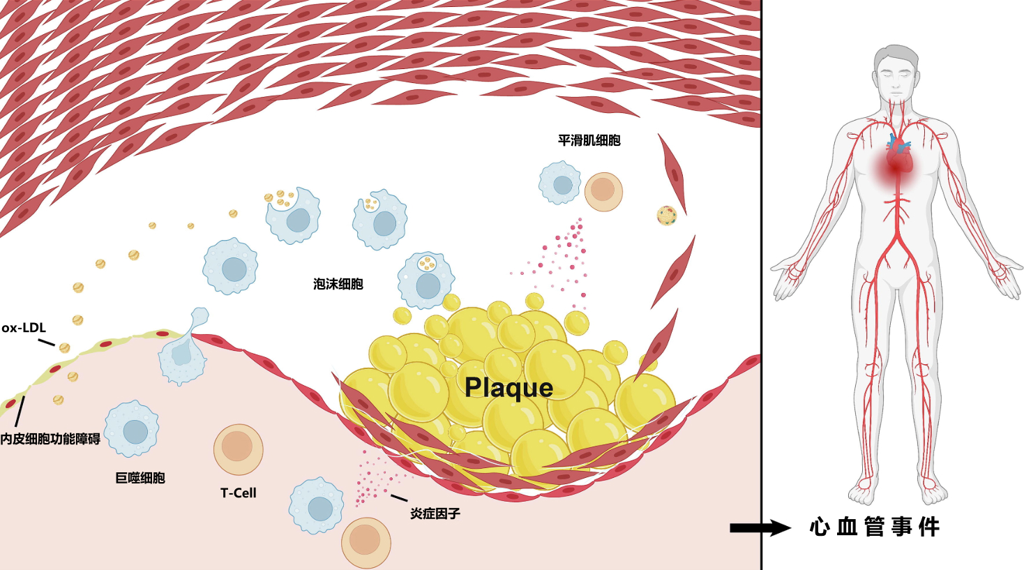 動(dòng)脈粥樣硬化是一個(gè)復(fù)雜的病理生理過程,由代謝紊亂、脂質(zhì)積累和炎癥驅(qū)動(dòng)。雖然在早期臨床上可能無癥狀,但動(dòng)脈粥樣硬化病變通常會(huì)轉(zhuǎn)化為易破裂的脆弱斑塊,并引發(fā)隨后的不良事件,包括心肌梗死、中風(fēng)和死亡。