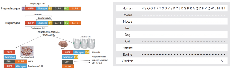 ①氨基酸少,并且衍生物同源性極高【胰高血糖素(1-29)是通過(guò)用激素原轉(zhuǎn)化酶2處理胰高血糖素原產(chǎn)生的 ,分子量為3485Da ;胰高血糖素樣肽-1(GLP-1),胰高血糖素樣肽-2(GLP-2),腸高血糖素和胃泌酸調(diào)節(jié)素來(lái)源于激素原轉(zhuǎn)化酶1處理的胰高血糖素原】 。