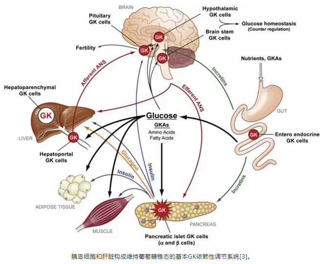 葡萄糖激酶(Glucokinase,GK)是己糖激酶的四種亞型之一,其在葡萄糖代謝的第一步中催化葡萄糖的磷酸化以產(chǎn)生葡萄糖-6-磷酸。葡萄糖激酶活性與胰腺中葡萄糖調(diào)節(jié)的胰島素和胰高血糖素分泌緊密相關(guān),充當(dāng)葡萄糖傳感器。在肝臟中,葡萄糖激酶在餐后處理葡萄糖并以葡萄糖依賴性方式將其轉(zhuǎn)化為糖原。因此,葡萄糖激酶在葡萄糖穩(wěn)態(tài)中具有重要作用。[2]