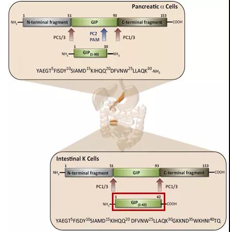 在血糖處于正常范圍或低血糖狀態(tài)時,GIP促進胰高血糖素分泌;但當(dāng)機體處于高糖狀態(tài)時,GIP可抑制胰高血糖素分泌,與GLP-1共同促進胰島素分泌。