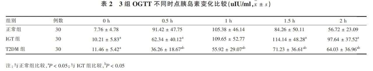 T2DM組在各時點平均血糖均高于正常組,在1h、1.5h和2h的平均血糖均高于IGT組,IGT組在0.5h、1h、1.5h和2h的平均血糖均高于正常組,差異均有統(tǒng)計學(xué)意義(P<0.05)。