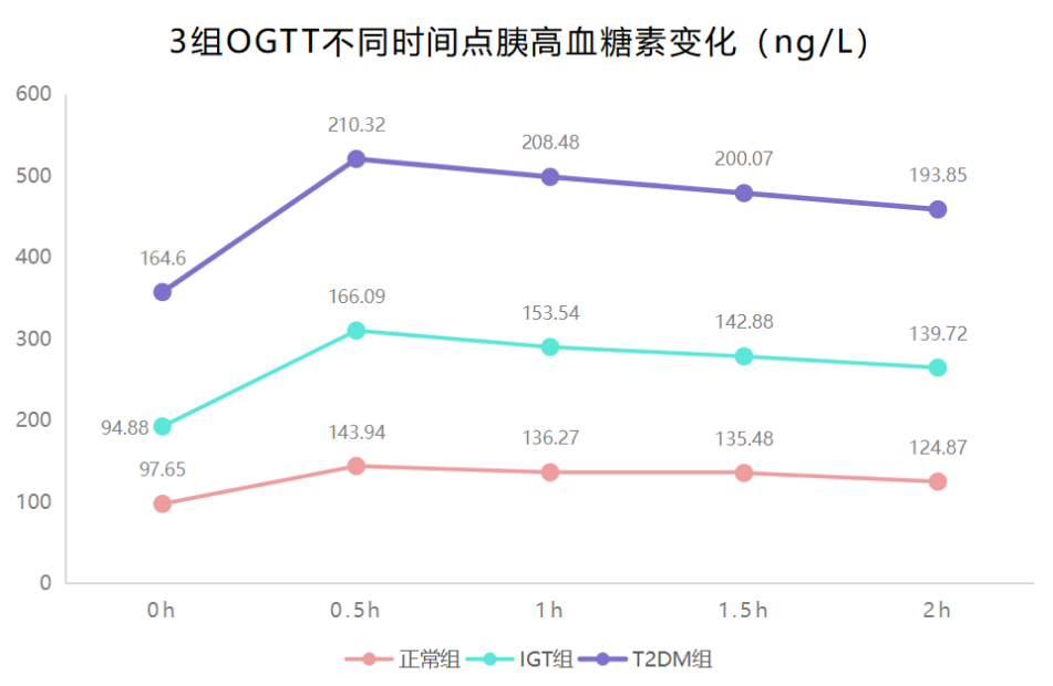 正常組胰島素平均最高值在糖負(fù)荷后1h,IGT組和T2DM組均延后,平均最高值出現(xiàn)在1.5h。T2DM組在各時點平均胰島素均低于正常組,在0.5h、1h、1.5h和2h的平均胰島素均低于IGT組,IGT組在0.5h低于正常組,在1h、1.5h和2h均高于正常組,差異均有統(tǒng)計學(xué)意義(P<0.05)。