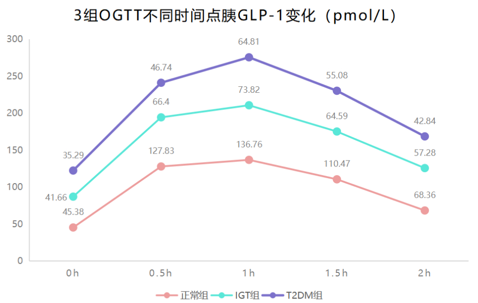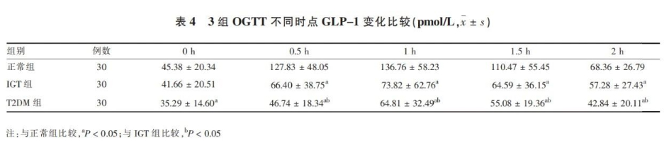 T2DM組在各時點,IGT組在0.5h、1h、1.5h、2h的平均GLP-1低于正常組,T2DM組在0.5h、1h、1.5h、2h的平均GLP-1低于IGT組,組間差異有統(tǒng)計學(xué)意義(P<0.05)。