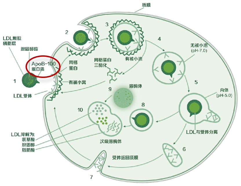 在正常情況下,天然LDL由LDL受體識別。LDL和LDL受體結(jié)合后,內(nèi)吞入細(xì)胞,與溶酶體結(jié)合。在溶酶體酶的作用下,蛋白質(zhì)降解為氨基酸,膽固醇酯水解為游離膽固醇和脂肪酸。此受體受到細(xì)胞內(nèi)膽固醇含量的下降調(diào)節(jié),當(dāng)細(xì)胞內(nèi)膽固醇的含量增多時,LDL受體的量便會減少。所以,天然LDL經(jīng)這一途徑代謝,不會引起膽固醇酯在細(xì)胞內(nèi)堆積。