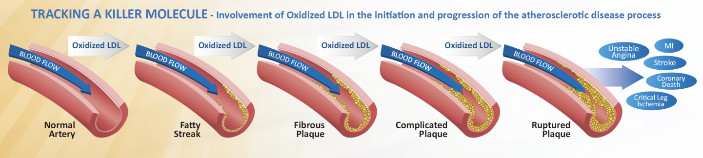 這些反應導致白細胞和血小板在受損的血管壁聚集,同時血漿中的低密度脂蛋白(LDL)也會滲透進入血管壁,并在那里氧化成氧化低密度脂蛋白(ox-LDL)。