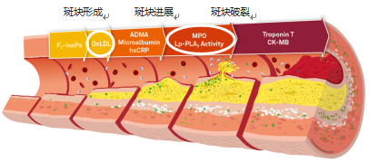 同時一些炎癥因子例如脂蛋白相關磷脂酶A2(Lp-PLA2)和髓過氧化物酶(MPO)會促進斑塊的不穩(wěn)定,會導致內皮細胞凋亡和內皮功能異常,刺激黏附因子和細胞因子的產(chǎn)生。這些物質也可通過趨化炎癥細胞進一步產(chǎn)生自我強化的循環(huán),生成更多促炎物質。