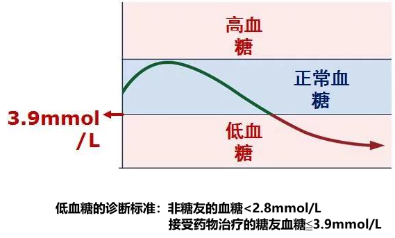 低血糖是指血漿中葡萄糖水平下降,成年人空腹血糖濃度低于2.8mmol/L(50mg/dL),糖尿病患者血糖值≤3.9mmol/L(70mg/dL),即可診斷低血糖。