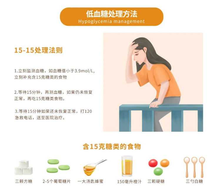 《中國糖尿病患者低血糖管理的專家共識》指出:患者發(fā)生低血糖現(xiàn)象,如果神志清醒,可以吞咽,推薦在可能情況下進食碳水化合物,如不能安全進食,須胃腸道外給糖或藥糾正低血糖。15-15處理法則便是方法之一:攝入15克快速消化的碳水化合物,等待15min再測血糖,如還未恢復正常,打120急救電話,送至醫(yī)院治療。