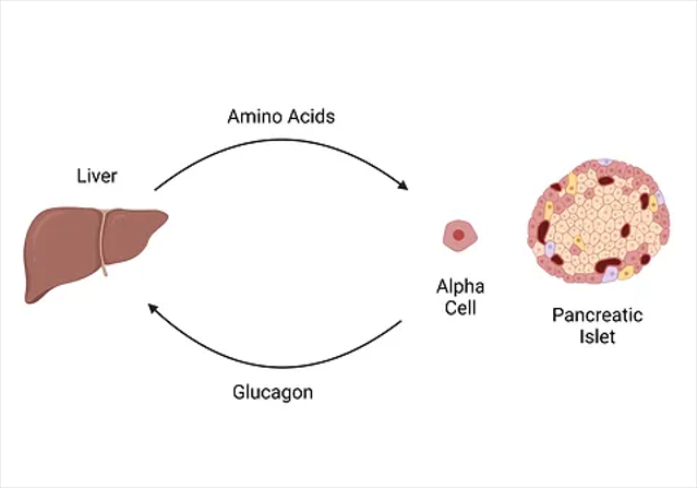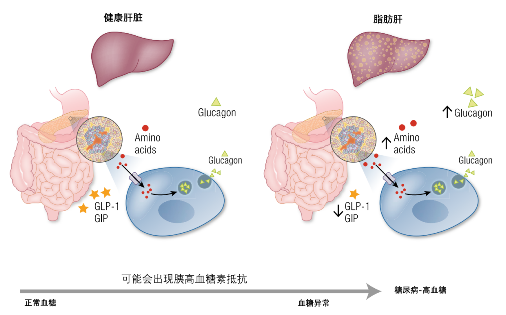 在代謝性疾病中,如2型糖尿病和/或代謝相關脂肪性肝病,肝臟脂肪變性會在肝臟脂質和氨基酸代謝水平上升時導致對胰高血糖素的抵抗,胰高血糖素刺激的尿素生成減少,循環(huán)中的氨基酸水平會升高,這種高氨基酸血癥會導致高胰高血糖素血癥。
