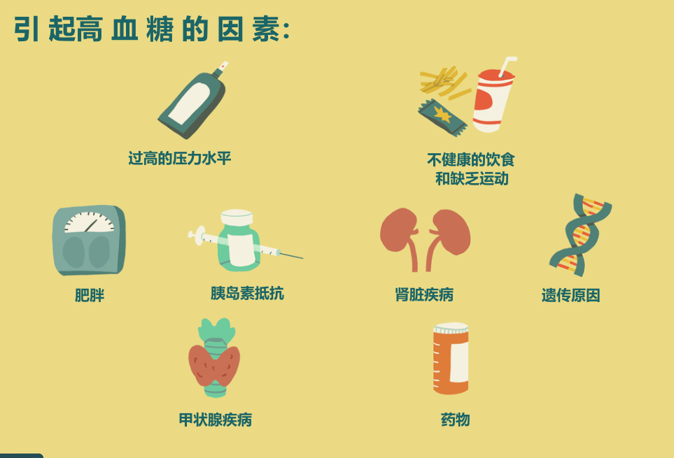 攝入過(guò)多的糖分,例如碳水化合物膳食和含糖飲料,消化的碳水化合物被分解成葡萄糖,葡萄糖溶解在血液中,這會(huì)導(dǎo)致血糖水平升高。