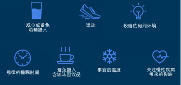 除此之外避免睡前飲用含有咖啡因的飲料、減少酒精攝入、設(shè)置適宜的溫度(16℃~21℃)等都有助于睡眠改善。對于患有糖尿病、心血管、精神類以及呼吸系統(tǒng)等疾病的患者,應(yīng)結(jié)合治療一同進(jìn)行改善。