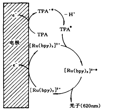 [Ru(byp)3] 2+,三丙胺(TPA)用來(lái)激發(fā)光反應(yīng)。在陽(yáng)極表面,兩種物質(zhì)同時(shí)失去電子。在電極板上[Ru(byp)3] 2+被氧化成[Ru(byp)3] 3+,TPA也被氧化成陽(yáng)離子自由基(TPA+. ),(TPA+. )自發(fā)地釋放一個(gè)質(zhì)子而變成非穩(wěn)定分子(TPA.),將一個(gè)電子遞給[Ru(byp)3] 3+,形成激發(fā)態(tài)的[Ru(byp)3] 2+.。[Ru(byp)3] 2+.在衰減的同時(shí)發(fā)射一個(gè)波長(zhǎng)為620nm的光子,重新回到基態(tài)[Ru(byp)3] 2+。這一過(guò)程在電極表面反復(fù)進(jìn)行,產(chǎn)生高效、穩(wěn)定的連續(xù)發(fā)光,并不斷增強(qiáng)。